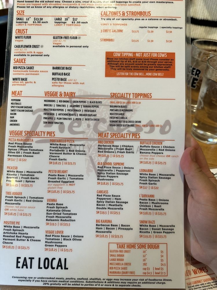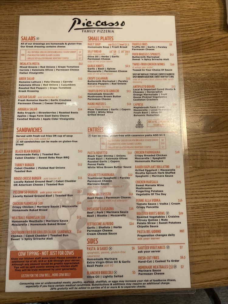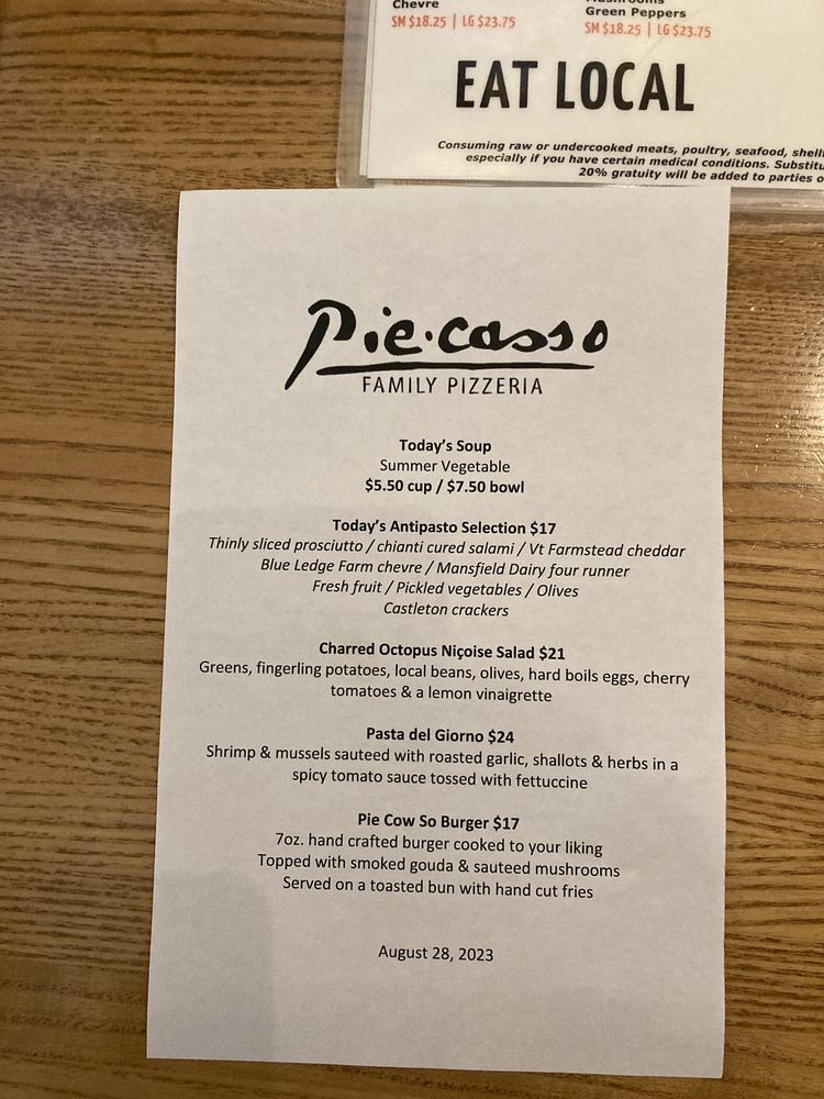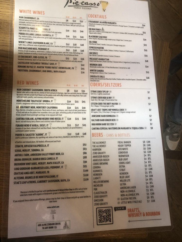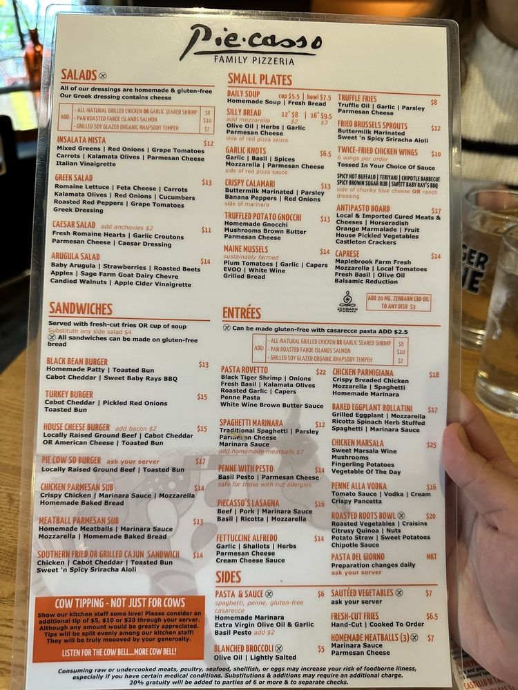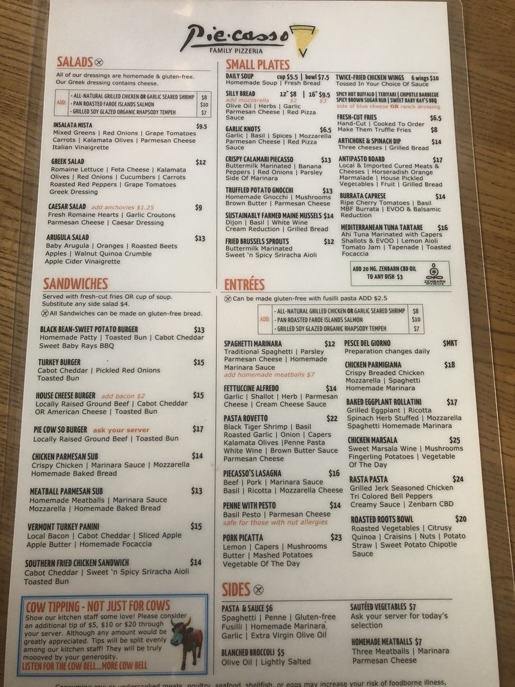 Piecasso is a vibrant restaurant in Stowe, VT, offering a diverse menu of burgers, pizza, and Italian cuisine. Brimming with options for vegans and vegetarians, the restaurant also caters to families with a variety of choices on the kids' menu. The friendly staff, quick service, and pleasant outdoor seating make it a top choice for dining in or takeout. Customers rave about the delicious pizzas, especially the veggie lover pie and gluten-free options. The crispy yet light dough and flavorful sauce elevate the pizza experience. The menu features a mix of traditional favorites like spaghetti and meatballs, as well as unique dishes like mushroom risotto. Overall, Piecasso stands out for its inviting atmosphere, diverse menu, and commitment to customer satisfaction.